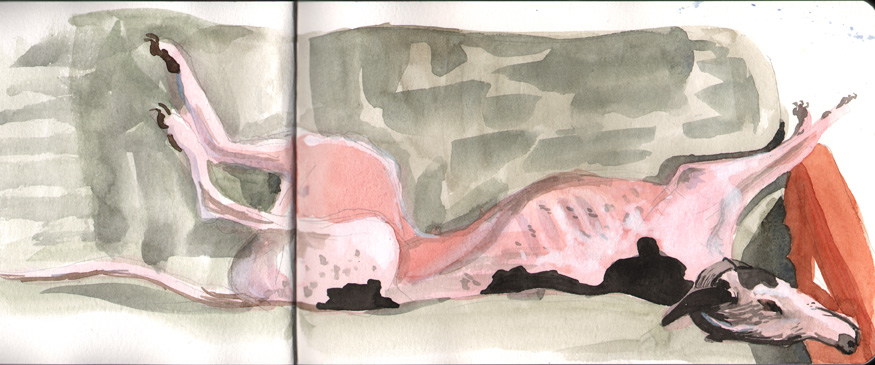 Here's my dog lying on the futon. Watercolors on watercolorpapersketchbook